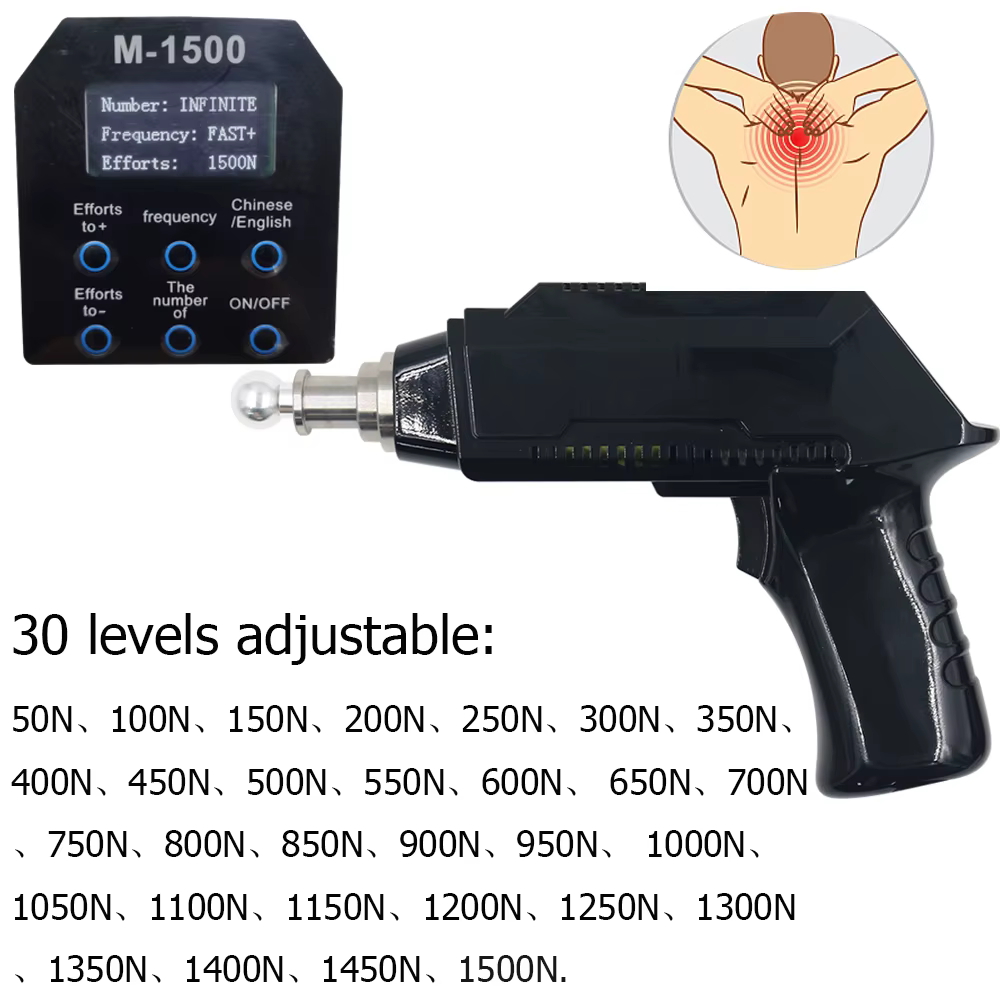 This product is an electric chiropractic massager. Through the unique design and professional strength test, adjust the button on the front of the handle to control the strength, press the “effort +” on the top of the display to adjust the strength, adjust the strength according to different needs, there are 5 working frequencies to choose from. This product is highly technical, professional, scientific in design, and conforms to the range of human endurance.