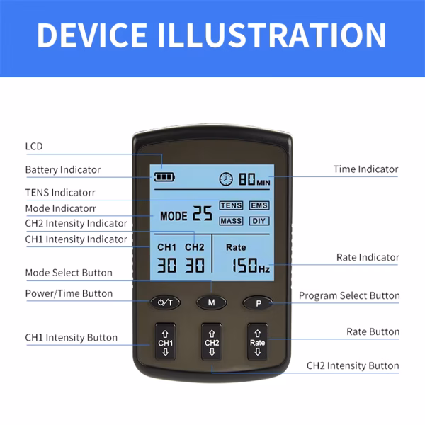 4.25 massage modes (8 TENS modes, 8 EMS modes, 8 Massage modes, 1 DIY mode), 30 levels of massage intensity can be adjusted to fully meet the actual needs of different groups of people.