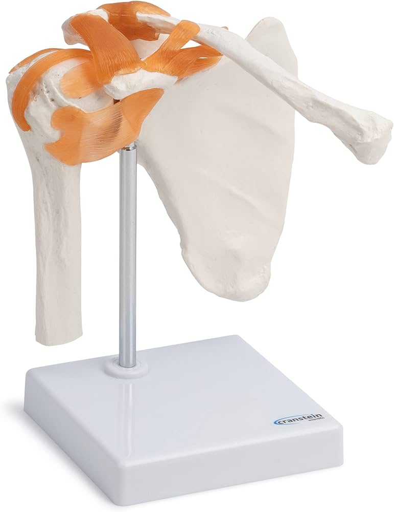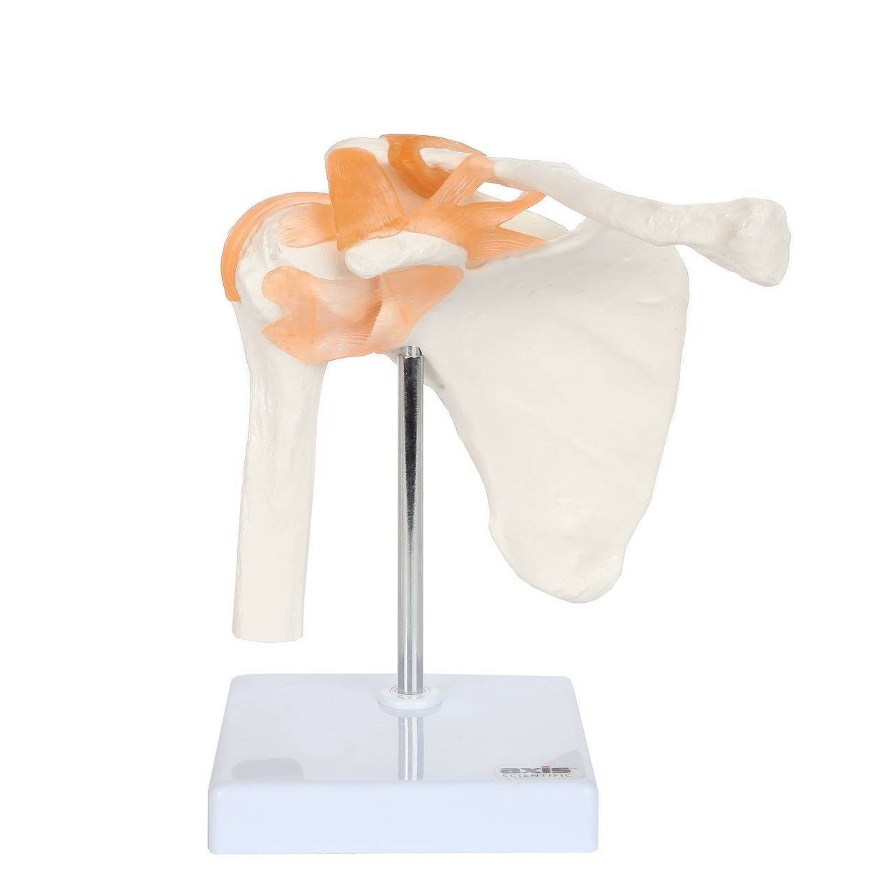 A life-size model of the shoulder joint, demonstrating its anatomy and biomechanics. It includes the scapula, clavicle, a portion of the humerus, and the joint ligaments. This highly flexible model clearly demonstrates abduction, anteversion, retroversion, and internal and external rotation.